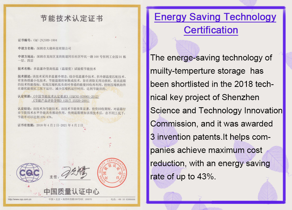 Con la tecnologia economizzatrice d'energia sviluppata da Douwin, gli imprenditori possono comprimere il costo energetico di fino a 38%. La camera è adatta a provare tutti i tipi di piccoli prodotti della batteria, quali le batterie, i telefoni cellulari, i computer, ecc.